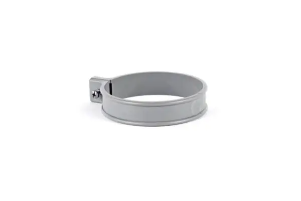 PVC ophangbeugel die om een HWA buis van 100 mm past. De beugel is voorzien van een schroef. De schroef kan gebruikt worden voor het monteren op een inslagpen of montage oog.