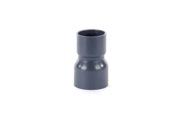 Druk PVC verloopmof van 90 mm naar 50 mm. Het verloop is aan één zijde voorzien van een 90 mm lijmmof en aan de andere zijde van een lijmmof van 50 mm. De verloopmof voldoet aan drukklasse PN12.5.